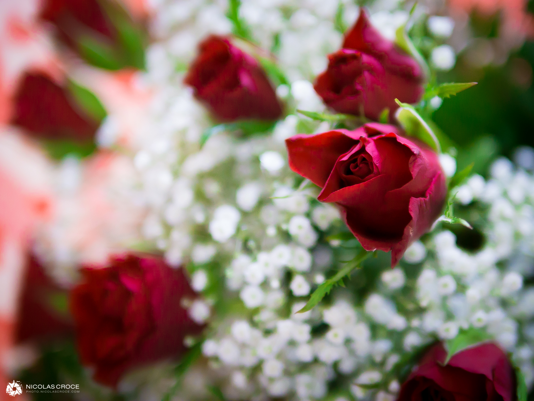 Voici la photo d’origine. Je vais simplement garder une rose en couleur, et convertir le reste de la photo en noir et blanc. Pour commencer, je choisit une taille assez grande du pinceau, et je “peint” grossièrement toute la partie de l’image qui sera convertie en noir et blanc. J’ai activé l’option “Afficher l’incrustation de masque sélectionnée” (case à cocher sous l’image), la partie peinte apparait donc en rouge sur la photo ci-dessous.