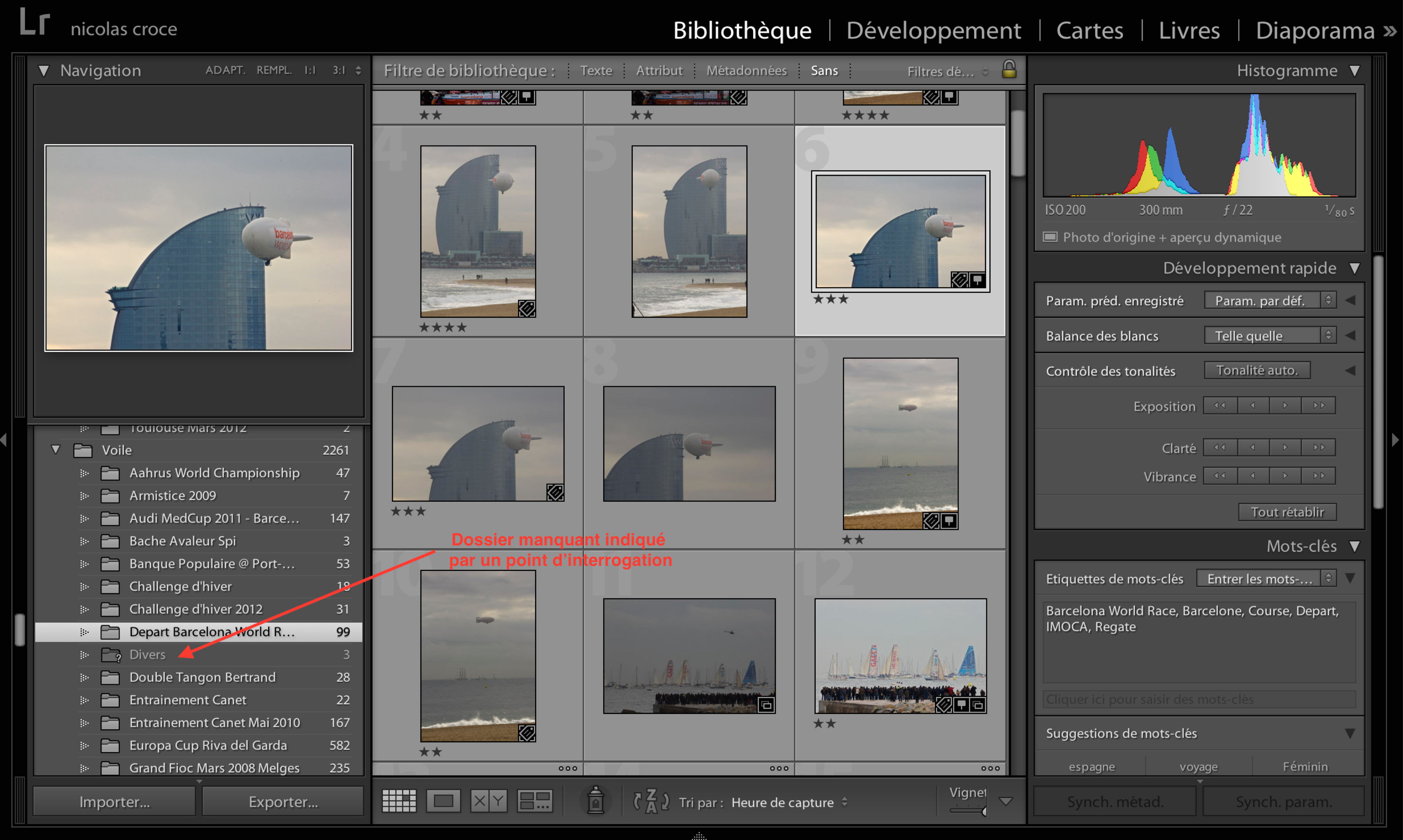 Toutefois, si vous déplacez ou renommez un dossier sur votre disque dur, et que ce dossier avait été importé dans Lightroom, vous verrez apparaitre un point d’interrogation devant le nom de votre dossier, comme le montre la capture suivante :