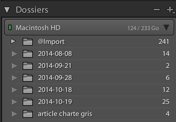 Sous le nom de votre disque dur, vous voyez apparaitre une liste de noms (@Import, 2014-08-08, 2014-09-21, etc. sur ma capture d’écran). Cette liste représente la liste des dossiers que contient votre disque dur, et qui ont été importés dans Lightroom.