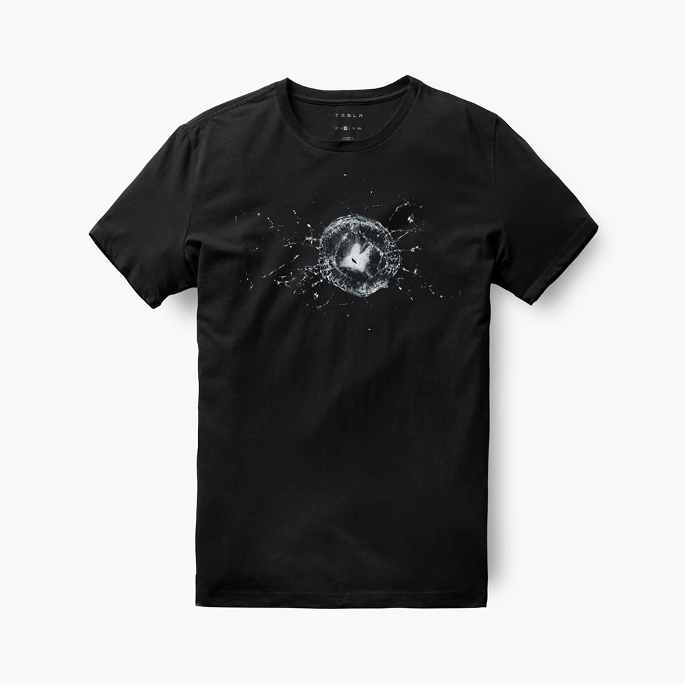 Vous pouvez acheter un t-shirt qui arbore fièrement l’impact laissé par la boule d’acier sur la vitre du Cybertruck.