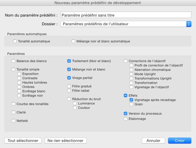 Enfin, la deuxième partie de la fenêtre présente une liste de tous les réglages que vous pouvez appliquer à une photo. Sélectionnez ici ceux que vous voulez conserver, et qui seront automatiquement appliqués à vos futures photos, lorsque vous utiliserez votre preset.