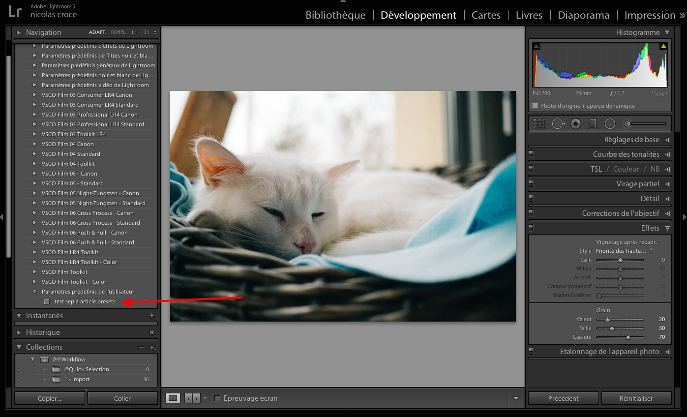 Je clic sur le nom de mon preset, dans la colonne de gauche de Lightroom :