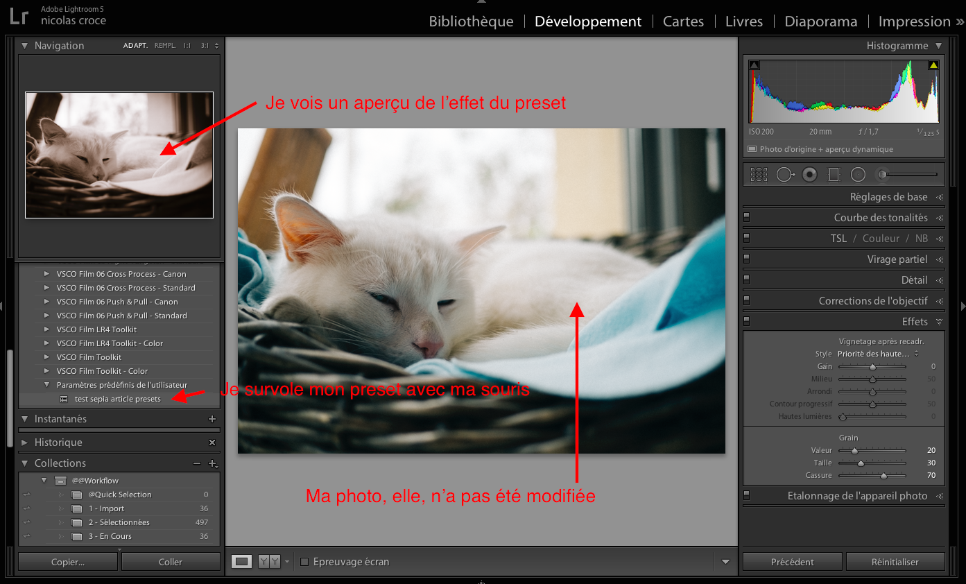 Lorsque vous passez votre souris au dessus du nom de l’un de vos presets, les réglages prédéfinis qu’il contient sont automatiquement appliqués à cette petite miniature. C’est un moyen très pratique de prévisualiser l’effet qu’aura un preset sur votre photo, surtout quand vous avez un nombre important de presets.
