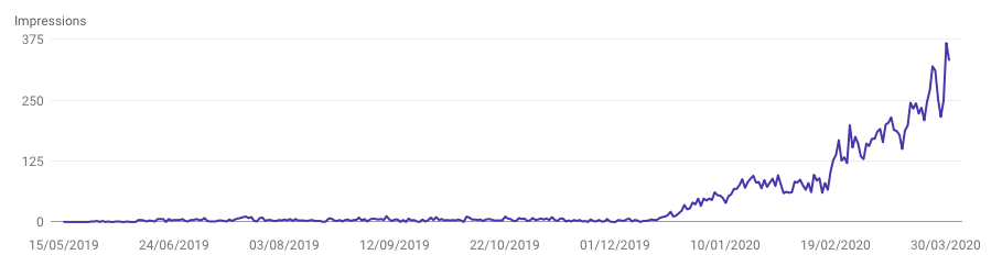 Le graphique ci-dessous vous montre l’évolution du nombre d’impressions de mon blog sur Google au cours de sa première année de vie (le nombre d’impressions c’est le nombre de fois où l’une des pages de mon blog — n’importe laquelle — apparait dans les résultats de Google suite à une recherche.)