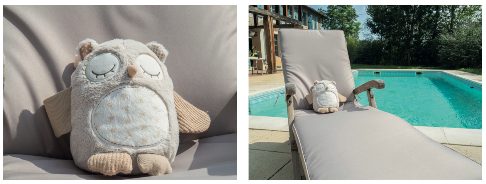 A gauche, la chouette en pleine séance de bronzage, photographiée ici avec une focale de 120 mm. A droite, avec une focale de 28 mm, le champ de vision est plus large. On voit que notre modèle bronze au bord de la piscine. Ces deux photos ont été prises du même point de vue.