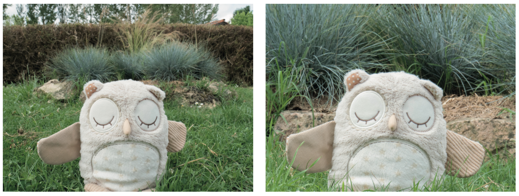 Sur la première photo, j’ai photographié la chouette devant un massif de graminées avec un 28 mm. Sur la seconde photo, la chouette n’a pas bougé. J’ai utilisé un 300 mm et j’ai reculé pour obtenir un cadrage proche de celui de la première photo. On a maintenant l’impression que la chouette est collée aux plantes qui se trouvent derrière elle.