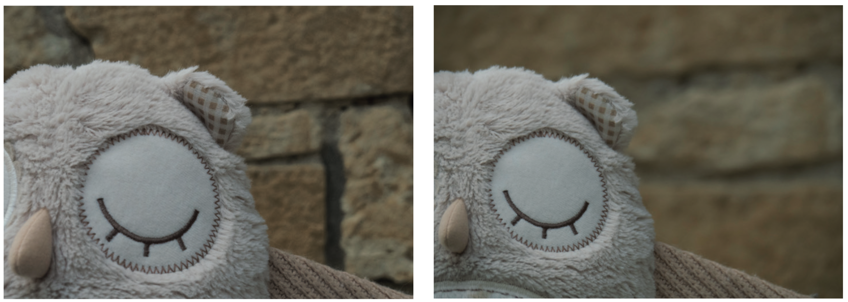 A gauche, une photo de la chouette devant un mur de pierre, prise avec une focale de 50 mm et une ouverture de f/5,6. A droite, la même vue réalisée avec la même ouverture de f/5,6, mais cette fois avec une focale de 300 mm. L’arrière-plan est beaucoup moins net car la profondeur de champ est moins importante.