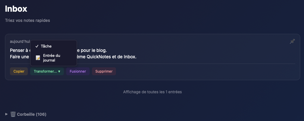 - Si c’est un évènement ou quelque chose que j’ai fait, je transforme la note en entrée pour mon journal, et là aussi, en deux clics seulement. Transformer > Entrée du journal. C’est enregistré, je pourrai le retrouver si besoin, et la note disparait.