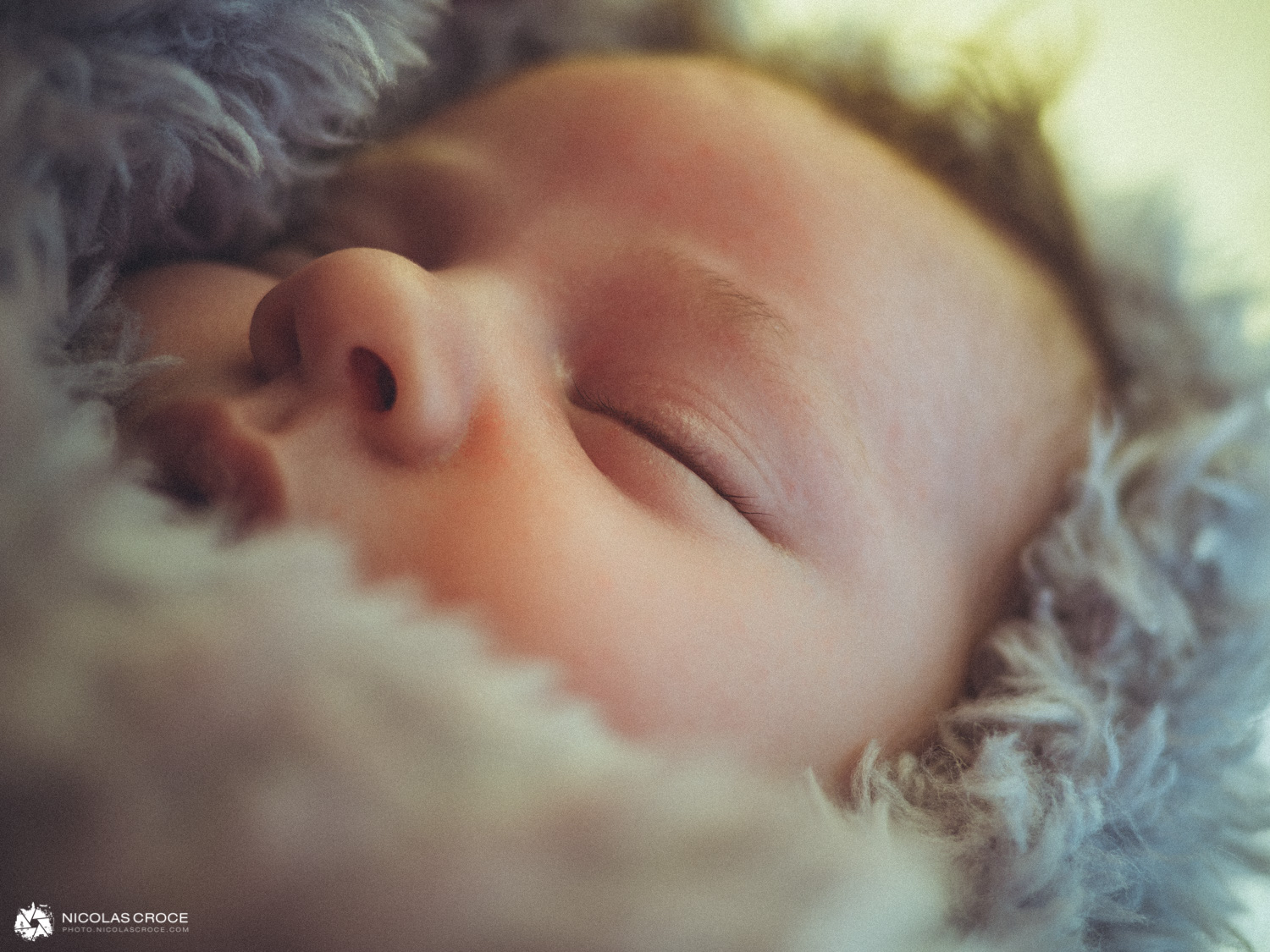 Plus sérieusement, la première chose à laquelle faire attention quand tu photographie un enfant, et c’est d’ailleurs pareil pour un adulte, c’est l’endroit ou tu fais la mise au point. Essaye toujours de viser les yeux. Si les yeux sont nets, la photo serra exploitable. Si les yeux sont flous, elle sera ratée (en règle générale, après tu peux vouloir délibérément faire la mise au point ailleurs que sur les yeux). Vu qu’un enfant bouge beaucoup, il vaut mieux éviter les profondeur de champ trop petites. Si tu règles ton appareil pour obtenir une profondeur de champ très petite, le moindre mouvement de ton fils vers l’avant ou vers l’arrière le fera sortir de la zone nette de ta photo. Pareil si tu te loupes sur la mise au point : si la profondeur de champ est trop petite, la moindre erreur et ta photo sera ratée. Avec une profondeur de champ plus importante, ça te laisse plus de marge de manoeuvre. Pour une profondeur de champ importante, utilises une ouverture moyenne ou petite. f/8, f/11, etc. Relis cet article si tu en as besoin : Comprendre l’ouverture en photographie. Les faibles profondeurs de champs, c’est seulement quand il dort. Pour la photo ci-dessous, j’étais sur une ouverture de f/1.7, donc une profondeur de champ très faible. Le moindre mouvement aurait fait sortir son oeil de la zone de netteté.