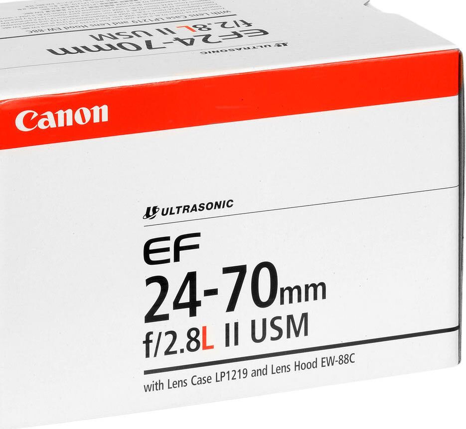 L’objectif de cet exemple est le Canon EF 24-70mm f/2.8L II USM. Comme vous le voyez, les mêmes informations sont inscrites sur la boite et sur l’avant de l’objectif.