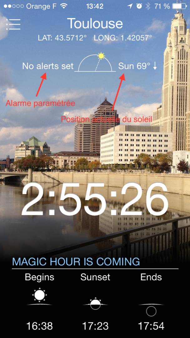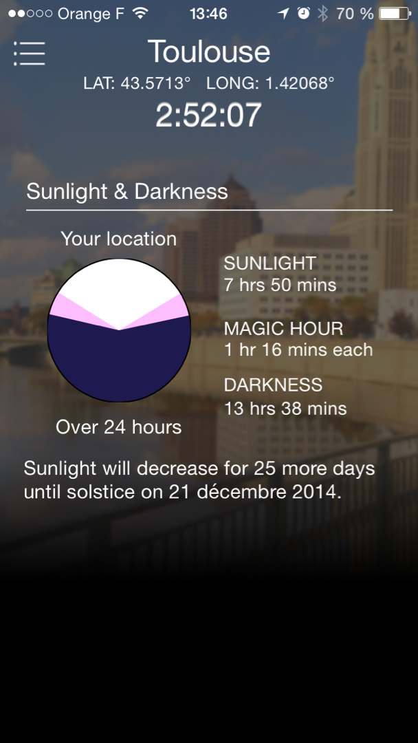 Le principe de fonctionnement de Magic Hour est très simple : L’application se sert de votre position géographique et de la date du jour pour calculer la position du soleil dans le ciel. L’heure magique indiquée par l’application commence lorsque le soleil est à 6° au dessus de la ligne d’horizon, et se termine lorsqu’il se situe 6° sous la ligne d’horizon. Que ce soit au lever du soleil ou au coucher, c’est entre ces deux positions relatives à l’horizon que la lumière est la plus intéressante pour un photographe.