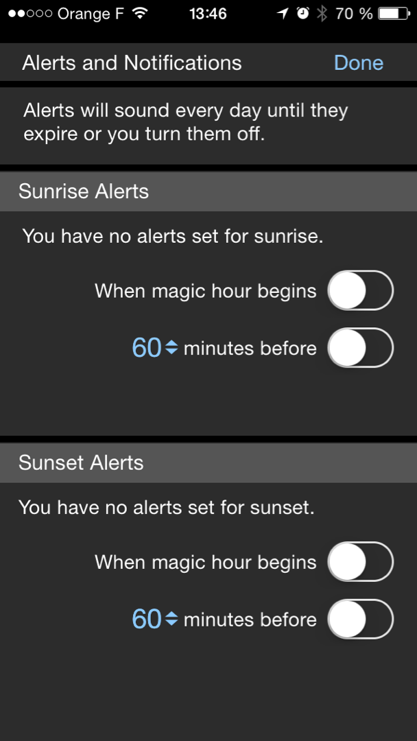 Si vous avez peur de ne pas vous réveiller pour le prochain lever de soleil, ou ne pas risquer d’oublier de quitter votre bureau pour aller prendre des photos au soleil couchant, l’application Magic Hour vous permet de paramétrer des alarmes. Pour cela, cliquez sur l’icone de menu situé en haut à gauche de l’écran, puis sur "Alerts and Notifications".