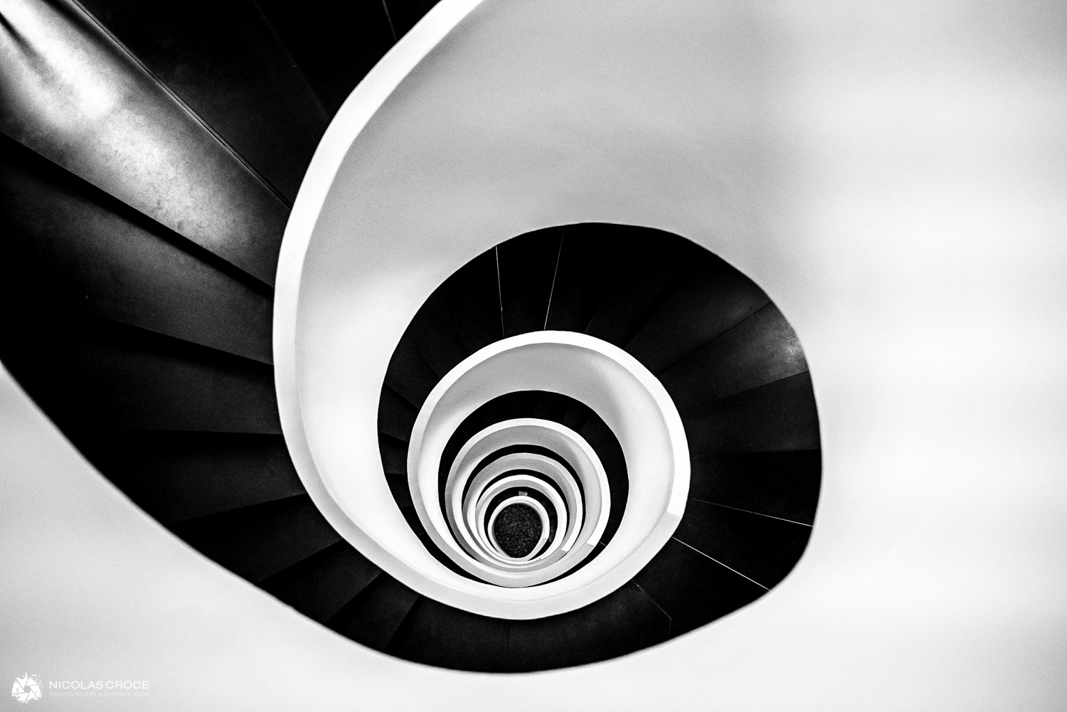 - J’ai déplacé le curseur « Contraste », le curseur « Noirs » et le curseur « Blancs » pour augmenter le contraste entre l’escalier noir et le mur blanc (Exposition, contraste, et gestion de la lumière dans Lightroom)